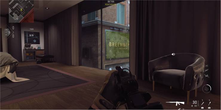 Objective modes like Search and Destroy and kill-based modes like Team Deathmatch will both let you benefit from camping at the Penthouse area of Breenbergh Hotel. It overlooks a wide open lobby that one of the bomb sites is in SND and is a popular location in TDM.