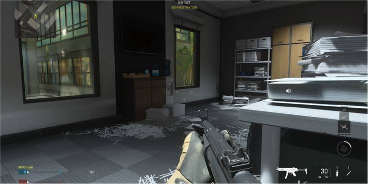 Embassy has several buildings with multiple floors. These buildings have rooms with windows that will give you angles over much of the map. In the Administration building’s second floor, littered with shredded paper, you’ll be able to see the mid-lane of the map.