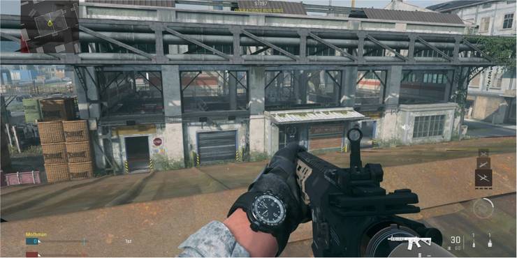 Crown Raceway is a wonderfully designed map with actual Formula 1 cars zooming around it. It is the inner portion of an F1 racetrack that has all the cover. One of the locations with the most amount of cover is the Blue Clubhouse area. It has a bar to hide behind, cubbies on the inside of the doors, and other counters that can block bullets.