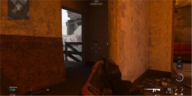 There is the Laundry Shop location in the middle of the Taraq map of Modern Warfare 2. It is a broken down building with a set of stairs that lead to the top. There is only one set of stairs, making that the sole entrance to the upper floor. On that upper floor, campers can watch the stairs or peek out a window to the south side of the map.