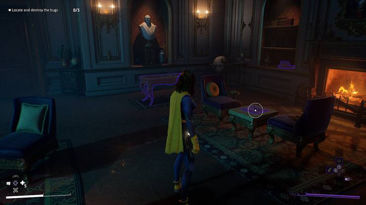 You’ll see several highlighted purple objects if you activate the AR scan. You’re free to interact with them, and Penguin will give you some details too. However, none of the bugs are in these highlighted objects. Hold the AR scan button to find the bugs until a reticle appears on the screen. At this point, you can aim at other suspicious objects in the room to scan them for bugs.