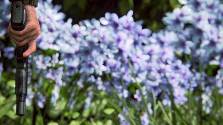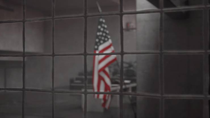 This is a very deep and meaningful shot of the world bleached in grey, the ol’ Stars and Stripes screaming red and locked behind bars. Unless you think it’s stupid, then it’s just a silly picture. Anyway, what’s it from?