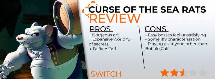 It doesn’t help that the characters are so incredibly unbalanced. While you could play as the heavy-hitter Bussa or sword-swinging Douglas and Akane, there’s no need when Buffalo Calf has unlimited projectiles that can clear an entire chamber with no effort, a dodge roll that makes her impervious to damage, and electric-based attacks that stun enemies. Once she’s fully upgraded, the only time you’d ever consider playing as anyone else is during co-op play. Curse of the Sea Rats looks the business, thanks to its stellar animation and art, mostly creative character designs, and varied environments that make exploring worthwhile. But thanks to uneven difficulty, grating writing, and a general lack of polish in every other area, its appeal is only skin-deep, and quickly outstayed its welcome.