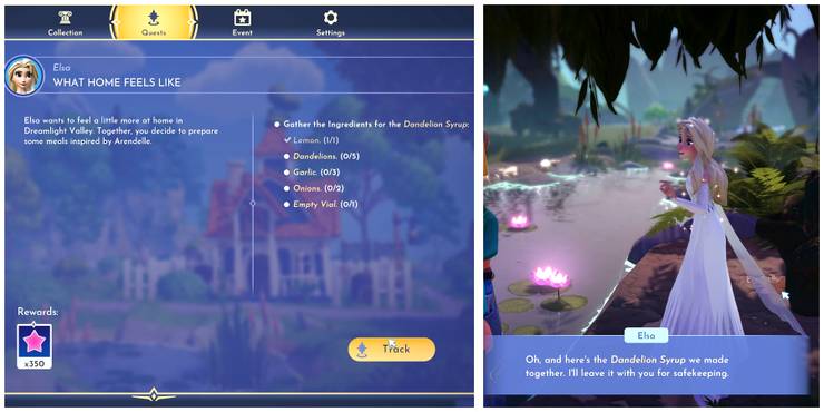 At the beginning of the What Home Feels Like Quest in Disney Dreamlight Valley, Elsa will ask Saviors to collect Dandelion Syrup’s ingredients to cook it together, as the syrup is required to make a Fish Pie. The materials are: