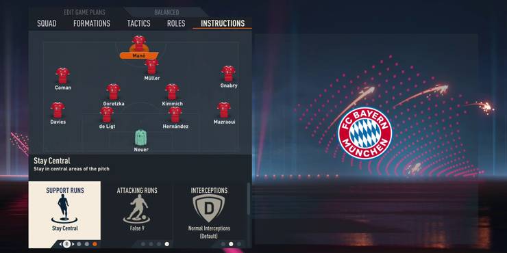 For instructions, Mané should stay central and operate as a false nine, allowing him to come a little deeper and drop in beside Müller from time to time. Speaking of Müller, he should be instructed to stay forward and allowed to roam freely so as to conserve his stamina and exploit any pockets of space that begin to form later on in the game. Coman and Gnabry should be instructed to cut inside, while the full-backs should be given permission to join in during attacks and overlap with the players in front of them whenever they do so.