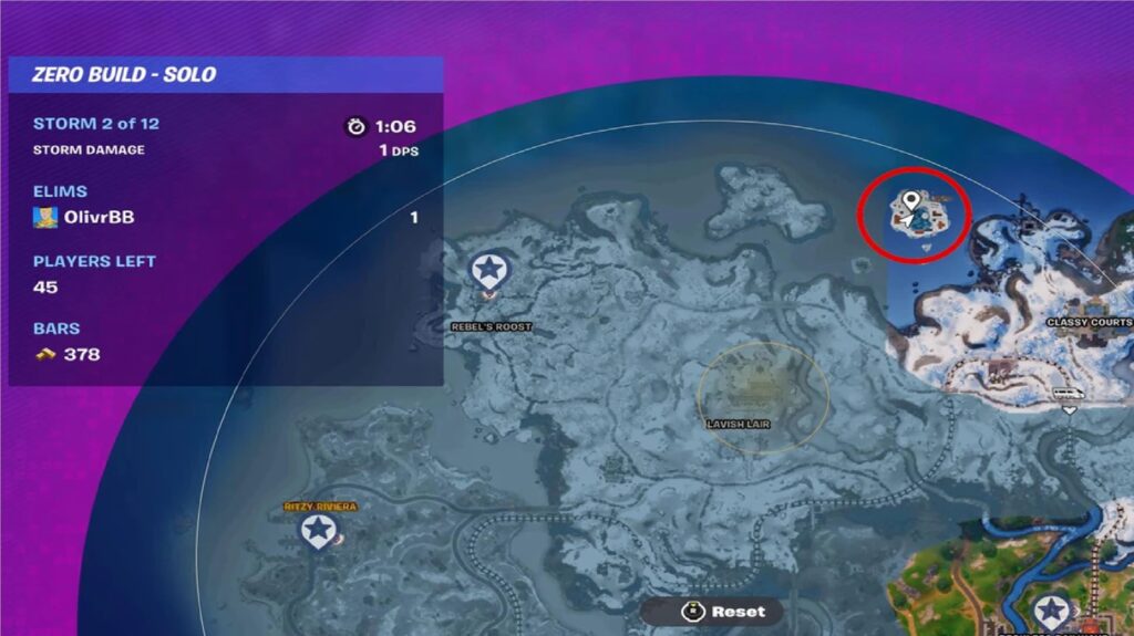 As you can see circled in red on the map below, this location can be found right at the top of the battle royale map (or ‘north’ if you know your compass points). It’s a small island off the coast of the main one.