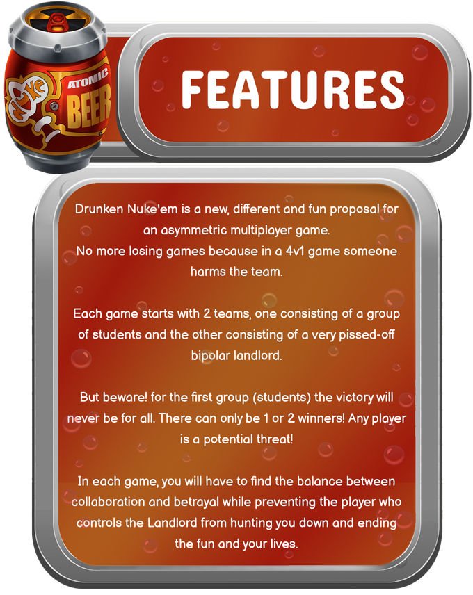 Drunken Nuke’em is a new asymmetric multiplayer video game very different from what you have seen so far. Venture into this madness with four unique college students with unique personalities. Or embody his Landlord, who loves order, silence, and… instruments of torture.