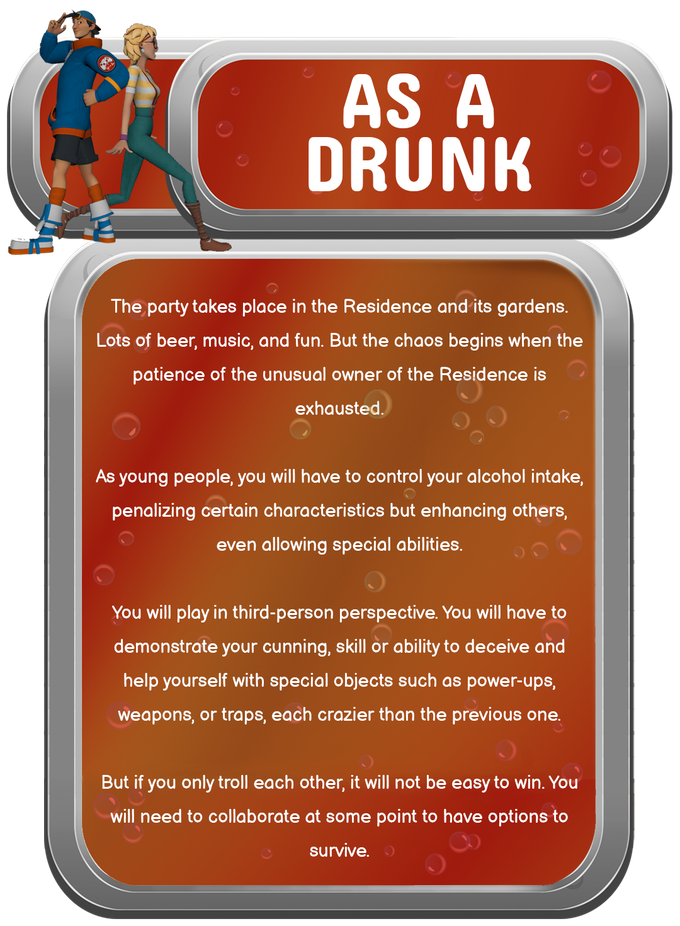 The game’s objective will be to have different maps, drunks, and “villains”, each one with specific common points but different themes and goals. However, keeping all the essence of madness and fun as a fundamental pillar.