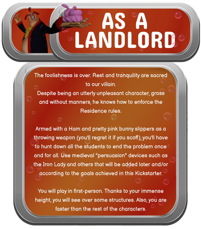 Have fun, get drunk until you throw up, use eccentric weapons and escape while collaborating and/or betraying your friends. As the Landlord, defend the tranquillity and silence that reigns in the Residence through violence and torture.