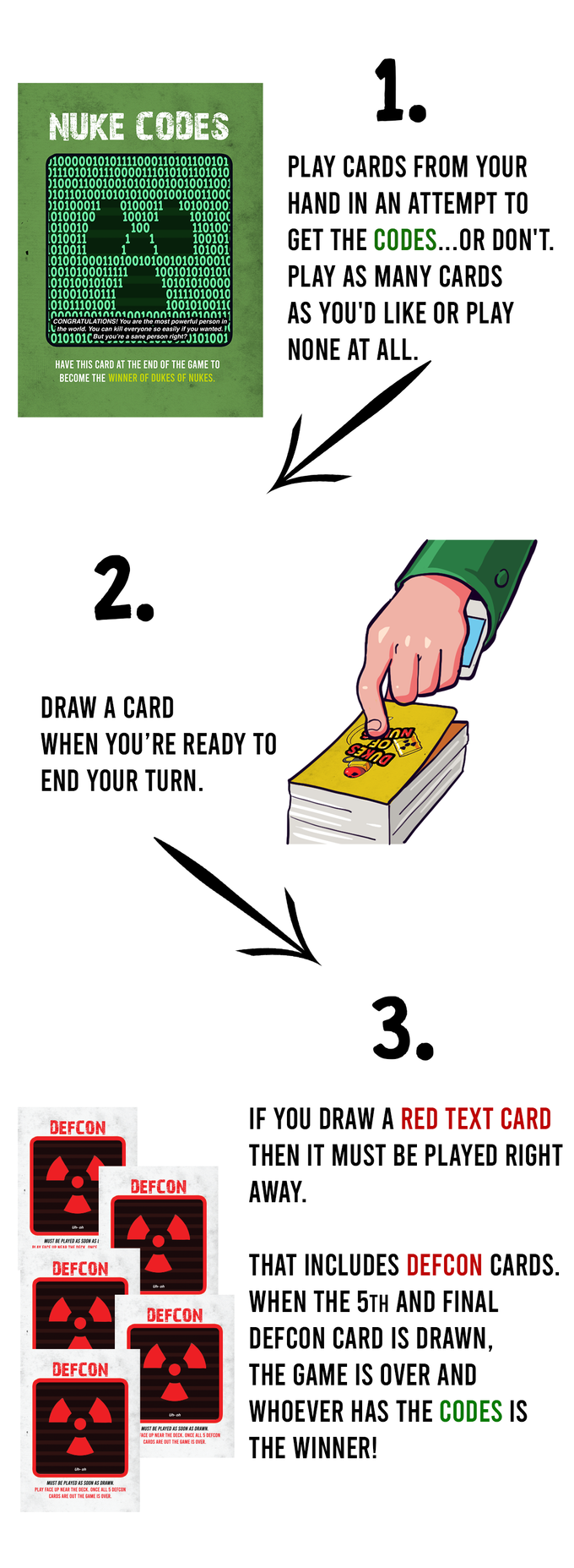 The goal of the game is simple. Be the one player with the nuke codes at the end of the game. The game begins with everyone being dealt 5 or 7 cards (depending on the amount of players) with one person randomly and secretly being dealt the Nuke Codes card.