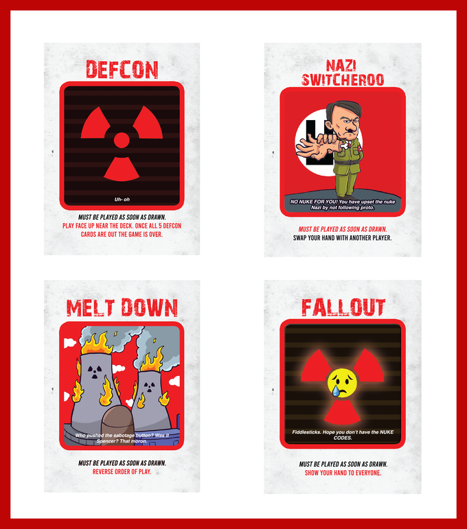 The 4 RED TEXT cards that must be played as soon as drawn are DEFCON, FALLOUT, MELT DOWN, and NAZI SWITCHEROO.