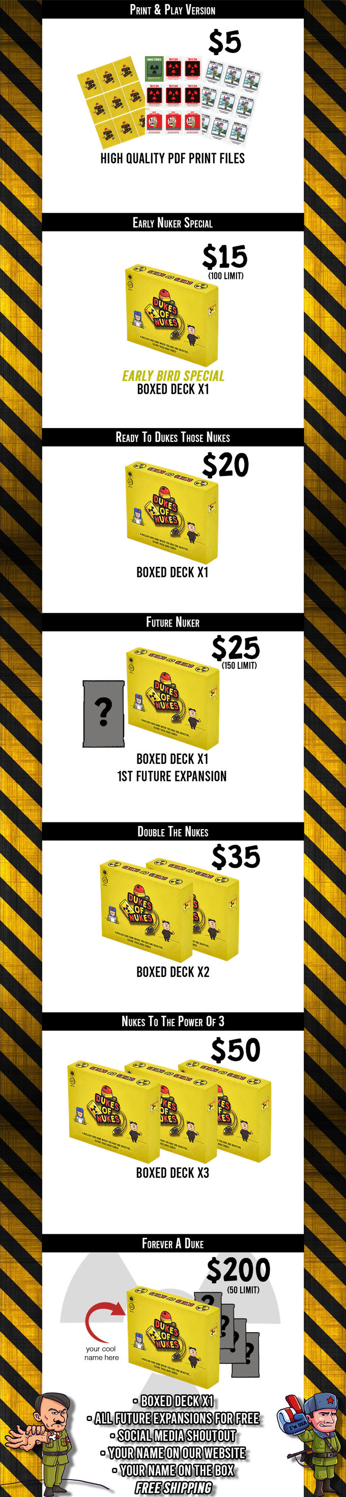 Since Spencer and Skyler have the game fully ready to go with their manufacturer at AdMagic the biggest risk is just distribution to backers and the timeline for that. They estimated their timeline for getting the game out to backers to be around July 2021. That is accounting for unforeseen issues and delays. So if everything goes right and there are no hiccups Dukes of Nukes should be ready for shipping sooner than July. Shipping costs will apply, so for more information on shipping costs, check out their kickstarter.