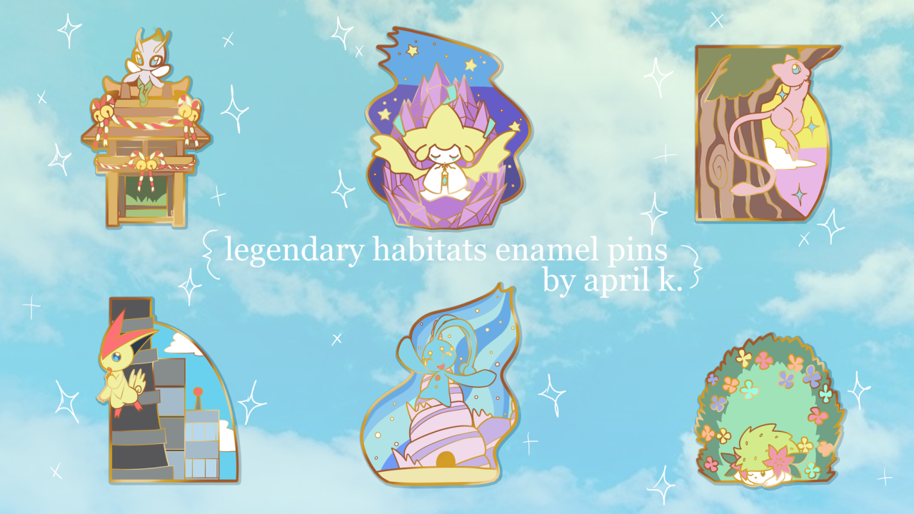 Hard enamel pins showing cute legendary Pokemon in their habitats.