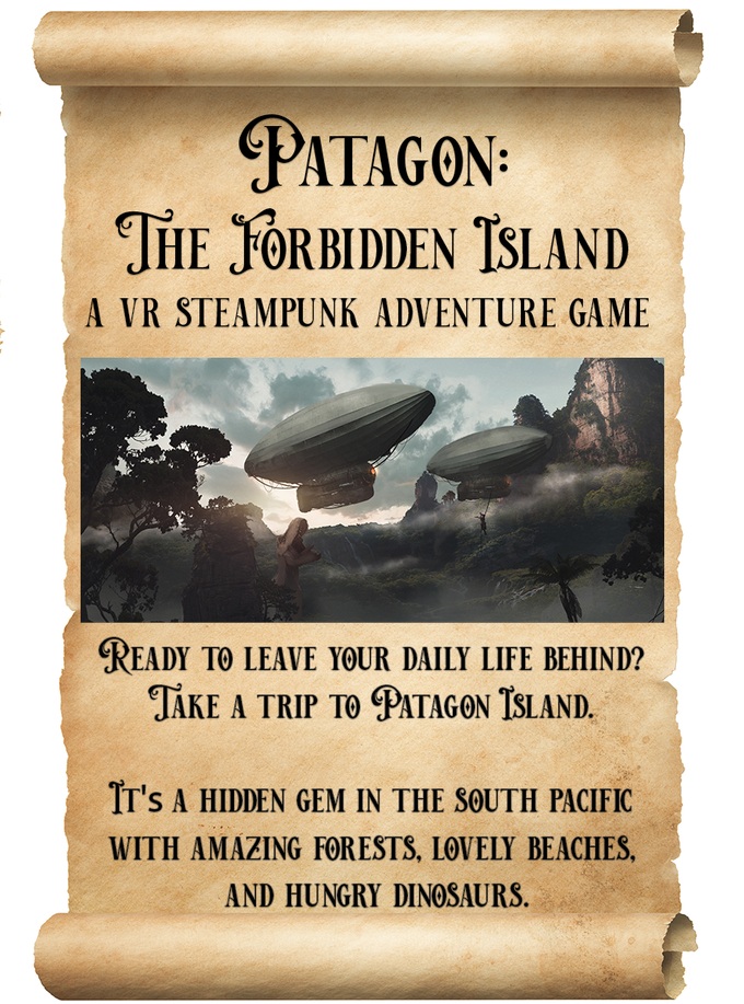 Patagon: The Forbidden Island is a steampunk open-world VR adventure game. It is inspired by some of the greatest movies and video games, such as Indiana Jones, Jurassic ParkFalloutBioShock and Skyrim.