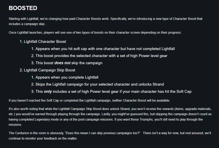 The Destiny 2 paid Character Boost is changing in Lightfall. When the new expansion launches, there will be two different kinds of Character Boosts available, depending on your progress. Once you hit soft cap with one of your characters, you’ll be able to boost your other characters up with a set of high Power level gear, just like normal. Once you finish the Lightfall campaign, there will be a new option to pay a fee and skip the campaign on your other characters, allowing them to gain access to Strand right away, and start with high Power level gear, provided your first character is at soft cap.
