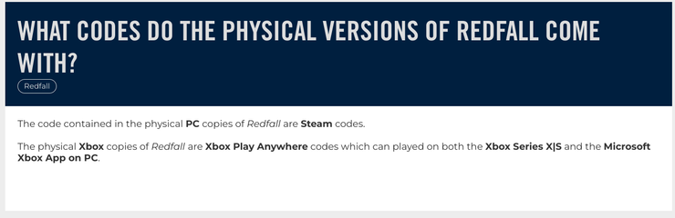 The post reads, “The code contained in the physical PC copies of Redfall are Steam codes. The physical Xbox copies of Redfall are Xbox Play Anywhere codes which can be played on both the Xbox Series X|S and the Microsoft Xbox App on PC”. This hasn’t been mentioned by Arkane, Bethesda, or Xbox up until now, but it’s likely to be true since it’s on Bethesda’s official support site.