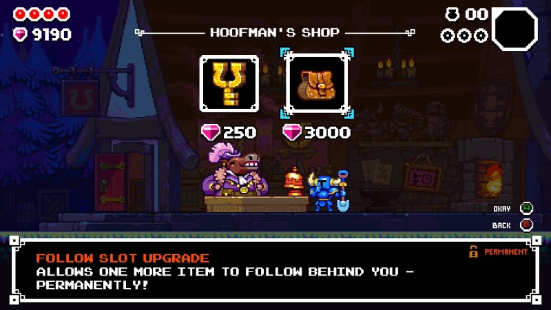 Rather than moving right through a beautifully pixelated stage, Dig tasks players with digging down, deeper and deeper into procedurally generated levels. This presents new feelings in the pantheon of emotions I feel while playing a Shovel Knight game: urgency and stress. Unlike many platformers out there, you can’t take the time to observe where you must go and how best to get there. You have to keep digging down and while going back up a few spaces is possible, it’s not easy. You’re not meant to backtrack because your goal is far below you. If you miss some gems or one of the stage’s three machine cogs, which unlock a special bonus reward, you probably missed your chance.