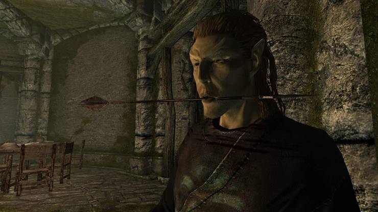 There are lots of neat little things that players come across in Skyrim, such as this NPC that seemingly caught an arrow in their mouth.