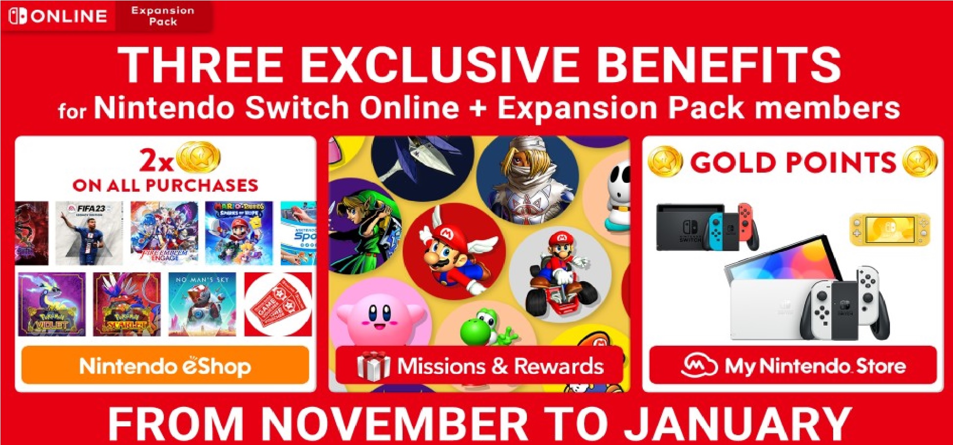 From November to January, Nintendo Switch Online + Expansion Pack members will receive double Gold Points (worth 10% of the purchase price) on all purchases of games, downloadable content, and even Game Vouchers from Nintendo eShop.